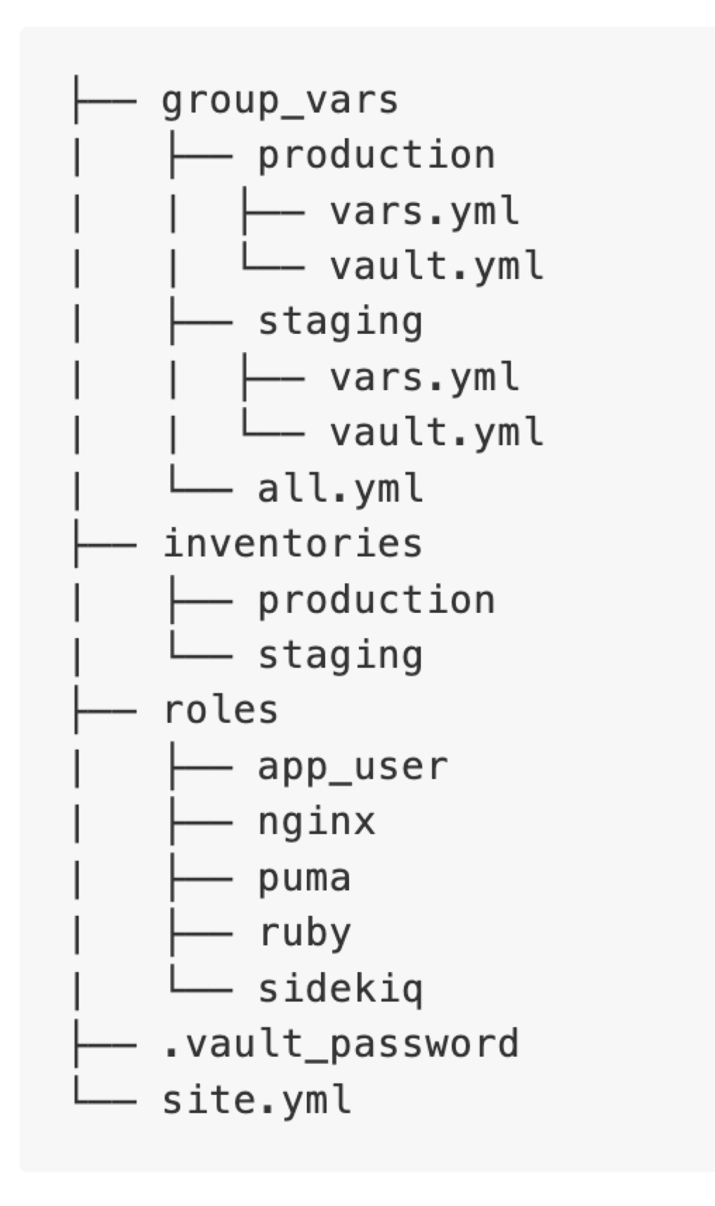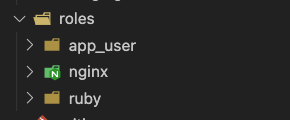 roles 資料夾內設定了每個 role 所需要執行的任務,因此通常會用最終目的來為每個 role 命名,像是用來安裝設置 ruby 的 role 就取名為 ruby。