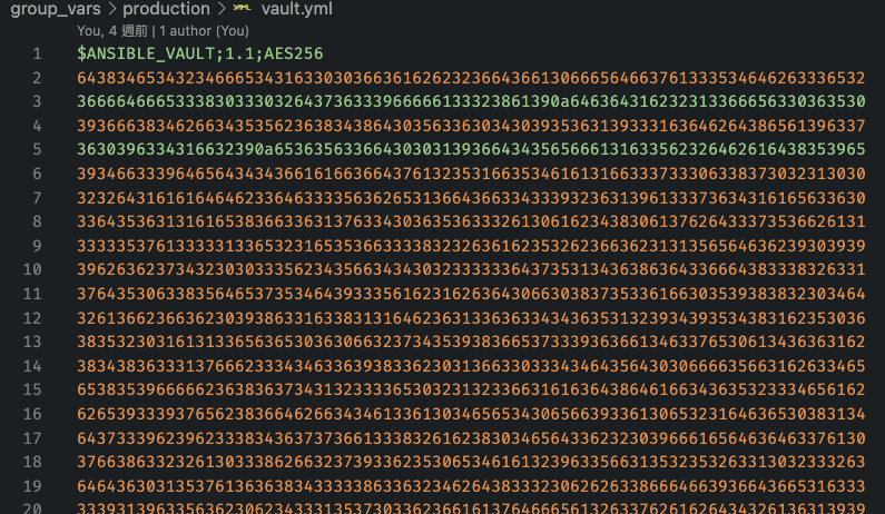 但是如果有敏感資訊的話,可以在 vault.yml 裡面另外設定變數,並且將 vault.yml 的內容加密。